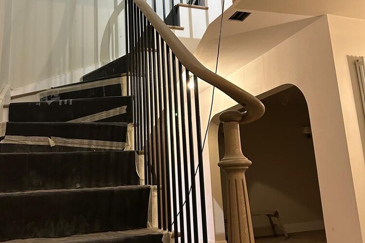 This hallway has been transformed thanks to the renovation work our team did on the staircase. It now boasts a full solid oak construction with ergonomic handrail, square newel posts, square spindles and wall-mounted handrail. Black accents were tastefully used on the spindles, newel caps and brackets for the wall-mounted handrail.