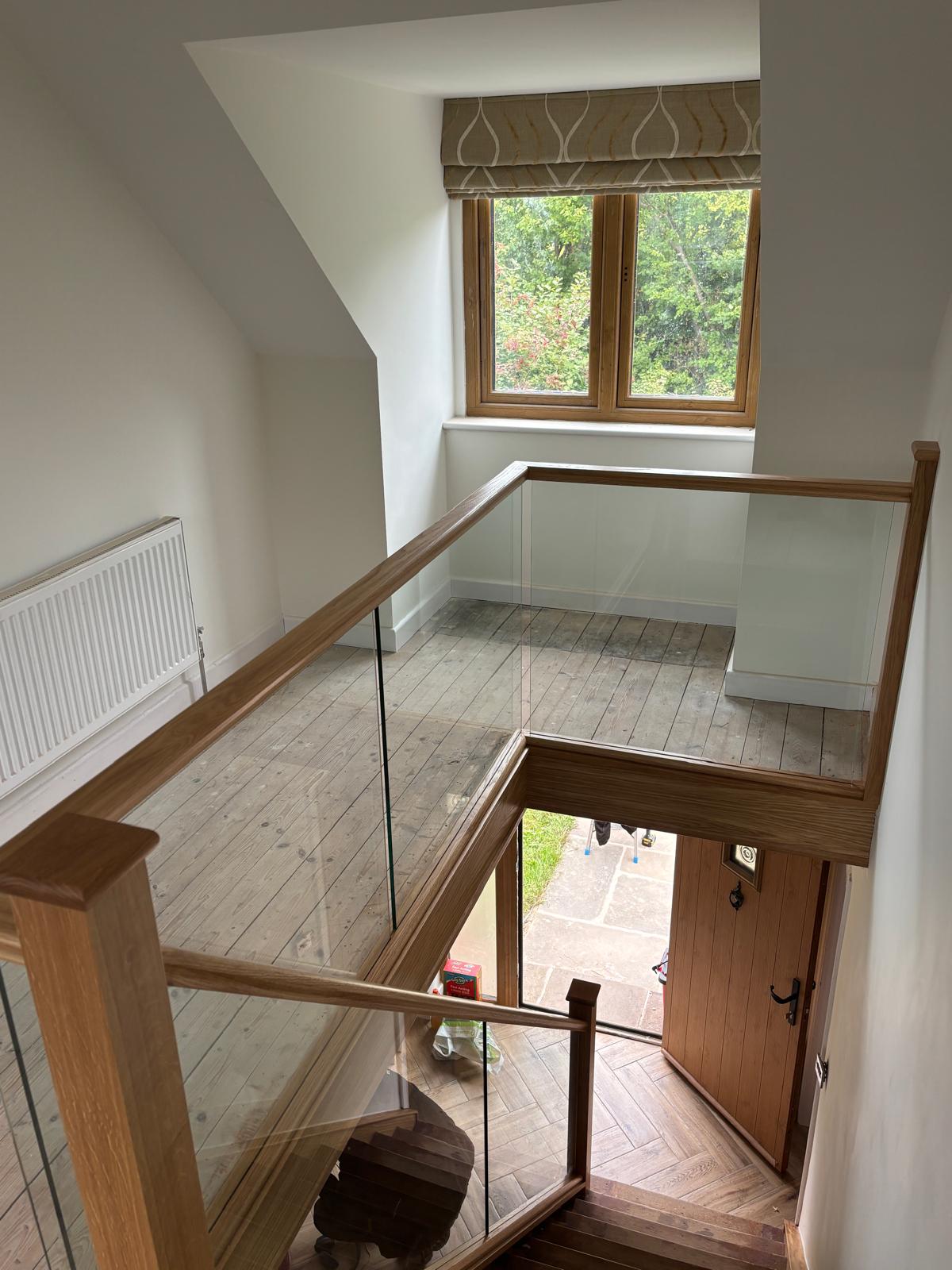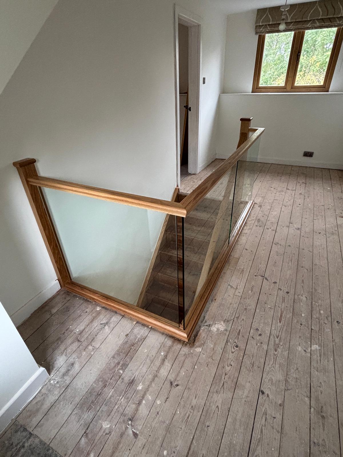 For this staircase renovation, we installed brand new solid oak square newel posts, flat caps, handrails, and baserails. The contemporary aesthetic was enhanced by the sleekly integrated glass balustrade.
