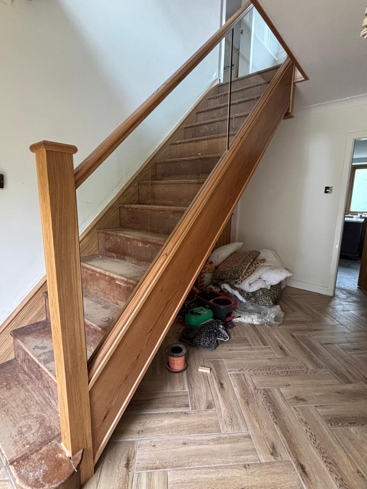 Staircase Renovation With Oak Newel Posts And Glass Balustrade