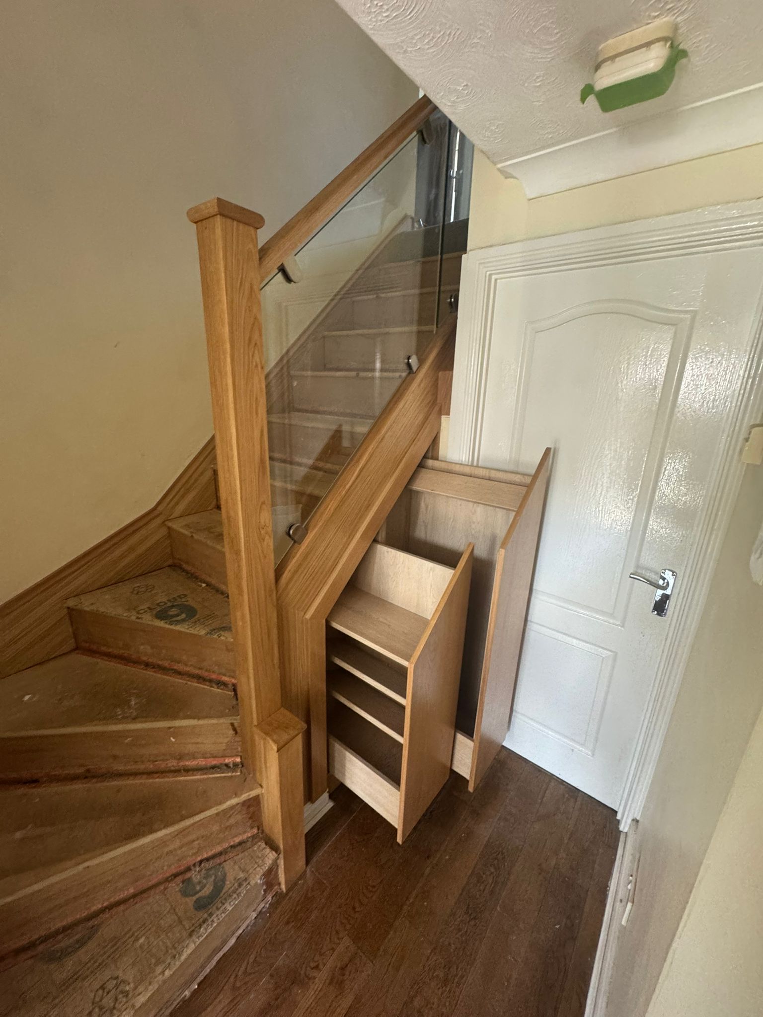 Pullout drawers with built-in shelving are one of the smartest under-stair storage solutions available. Finished in oak and paired with modern glass balustrades, they not only provide essential space-saving functionality but also enhance the overall staircase design. Perfect for hallways or living spaces, these drawers and shelves keep your home tidy while adding a stylish, bespoke feature that makes the most of every inch of space.